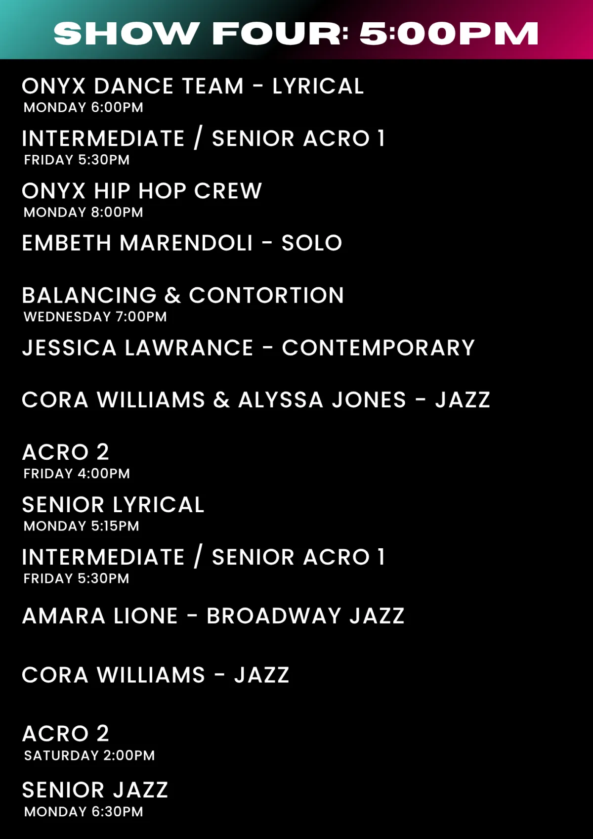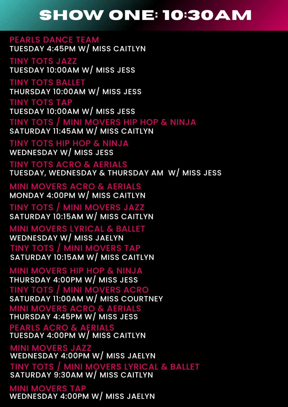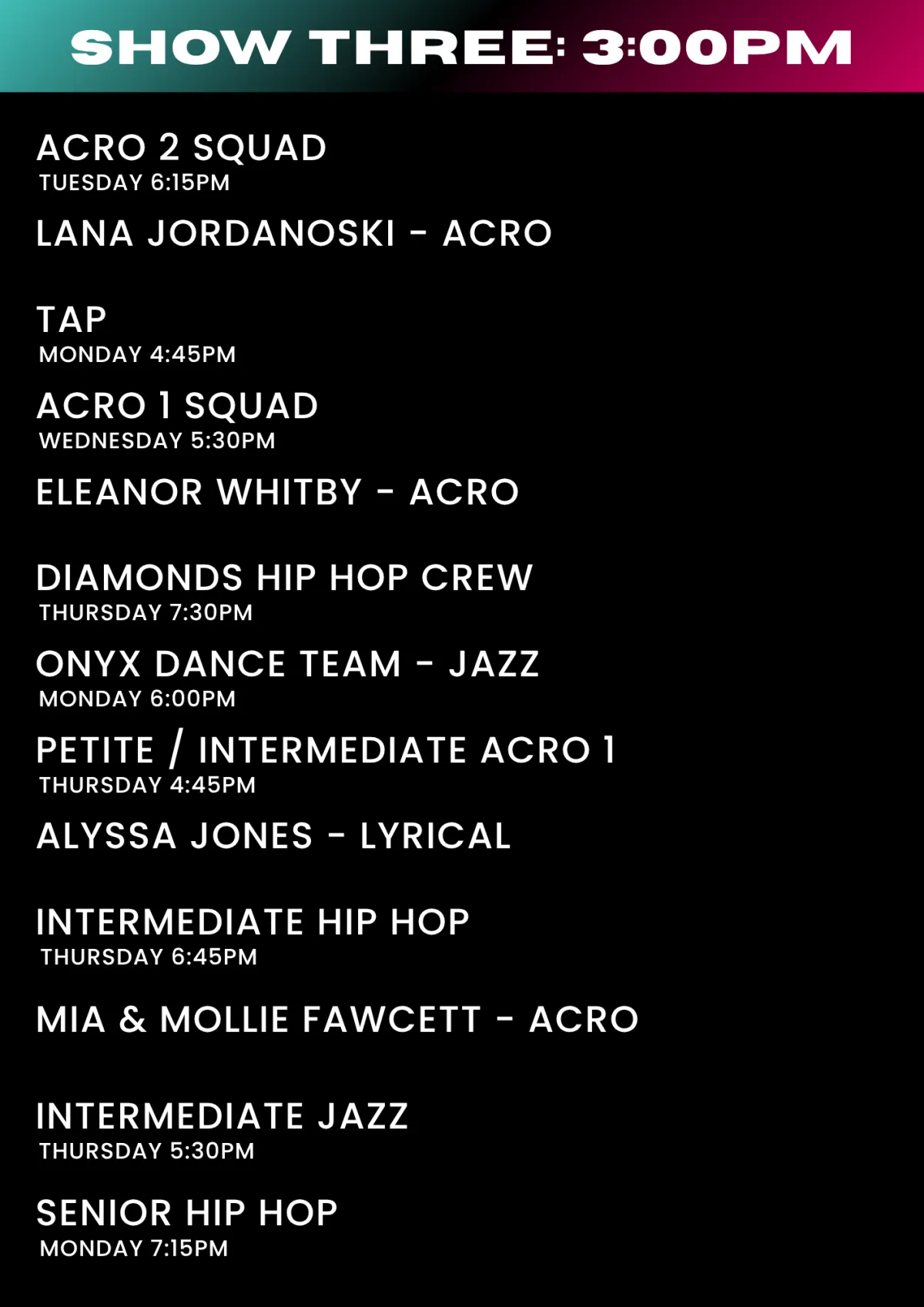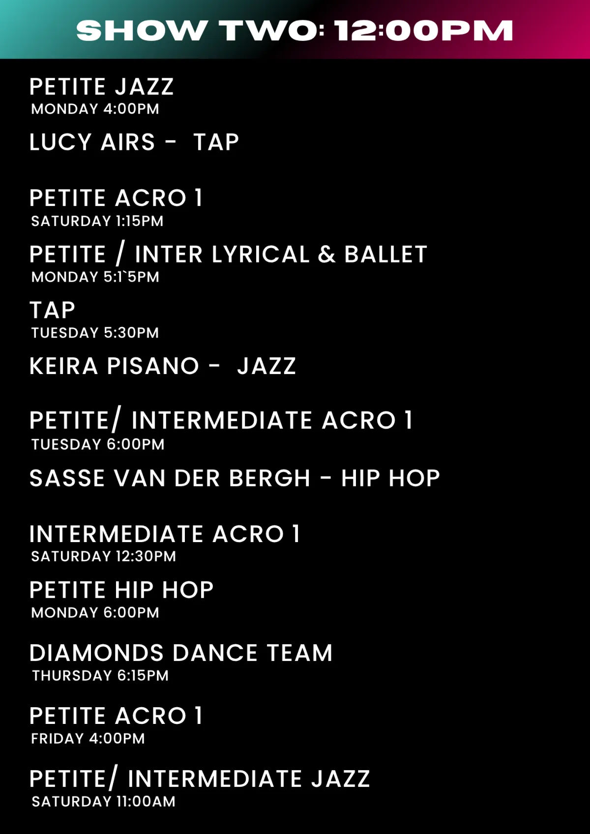 Please check the lists below for what show/s your child will be performing in. If you are unsure of your dancer's class names these can be viewed on the Parent Portal or on your Enrolment Confirmation.
